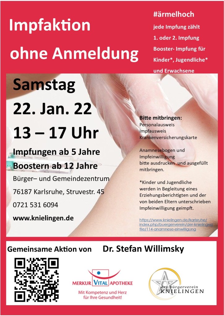 Nächste Impfanktion in Knielingen 🍀 Jede Impfung zählt, komm zur 1. – 2. Impfung oder zur Auffrischung.