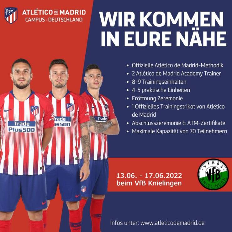 Es ist wieder soweit: wir dürfen ein neues Fußballcamp eröffnen und dieses Mal wird es zusammen mit einem Team von Atletico Madrid sein. Der Traditionsverein aus Spanien hat schon viele Talente geschmiedet und ist aus der Fußballwelt nicht mehr wegzudenken. Antoine Griezmann, Luis Suarez, Fernando Torres und viele mehr spielen dort und sind Vorbilder unserer kleinen und großen Kicker.